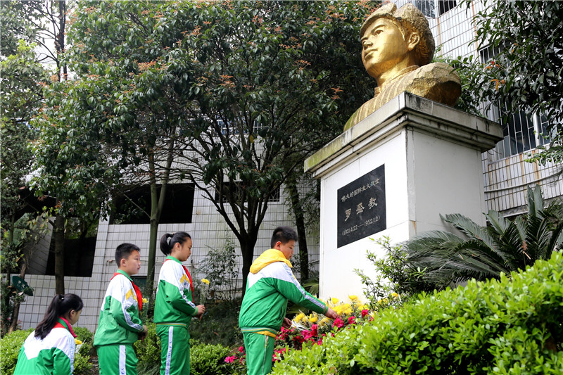湖南吉首大學(xué)師范學(xué)院附屬小學(xué)學(xué)生在為羅盛教烈士塑像獻花(2016年3月31日攝)。新華社發(fā)(彭彪攝)