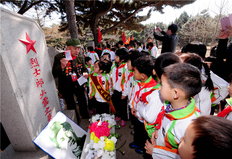 在沈陽抗美援朝烈士陵園,志愿軍老戰(zhàn)士李維波(左一)向?qū)W生們講述邱少云的英雄事跡(2014年4月3日攝)。新華社發(fā)(張文魁攝)