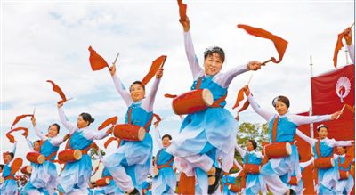 山東榮成市民文化活動公園,1000多名當(dāng)?shù)厝罕娗闷鹧模餐惆l(fā)走向全面小康生活的幸福與美好。 |