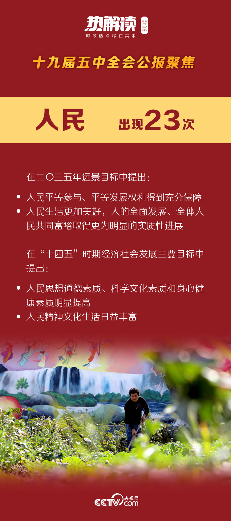 6000多字的公報(bào)中,“人民”一詞出現(xiàn)23次。“人民平等參與、平等發(fā)展權(quán)利得到充分保障”“人民精神文化生活日益豐富”“改善人民生活品質(zhì)”“不斷增強(qiáng)人民群眾獲得感、幸福感、安全感”“提高人民收入水平”“保障人民生命安全”……字字句句,都圍繞著“人民”二字,映射出以習(xí)近平同志為核心的黨中央,率領(lǐng)9000多萬(wàn)名中國(guó)共產(chǎn)黨員為人民謀幸福、為民族謀復(fù)興的奮斗圖景。