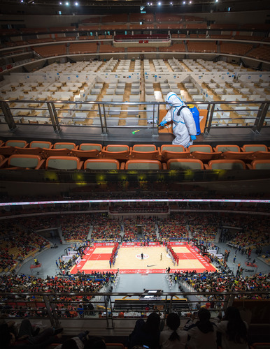 拼版照片上圖:3月8日,武漢體育中心方艙醫(yī)院送走最后一批痊愈患者,正式休艙。隨后,艙內(nèi)進(jìn)行全面消毒工作。這是志愿者在進(jìn)行消殺作業(yè)。下圖:10月4日,武漢體育中心方艙醫(yī)院休艙后舉行首場大型賽事。新華社記者 肖藝九 攝