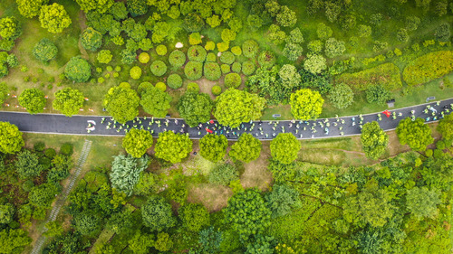 在江蘇省淮安市,體育愛好者在淮安森林公園進(jìn)行“全民健步走”活動(8月7日攝,無人機(jī)照片)。新華社發(fā)(干石泉 攝)