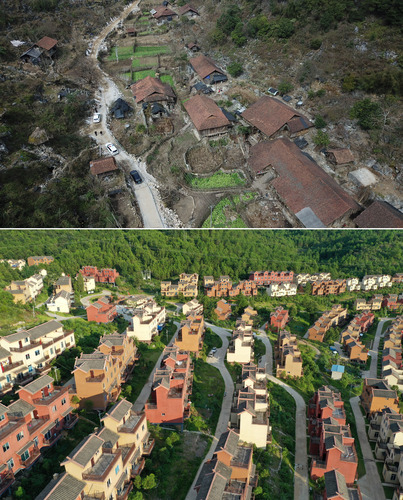拼版照片上圖:這是整屯搬遷前的廣西南丹縣里湖瑤族鄉(xiāng)董甲村么干屯(2018年1月10日攝)。村民們都搬遷到“千家瑤寨·萬戶瑤鄉(xiāng)”里湖王尚易地扶貧搬遷安置點(diǎn)。下圖:這是廣西南丹縣“千家瑤寨·萬戶瑤鄉(xiāng)”里湖王尚易地扶貧搬遷安置點(diǎn)(8月4日攝,無人機(jī)照片)。新華社記者 周華 攝