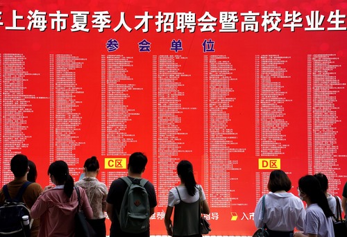 在“2020年上海市夏季人才招聘會暨高校畢業(yè)生面洽會”上,求職者了解招聘單位信息(7月25日攝)。新華社記者 劉穎 攝