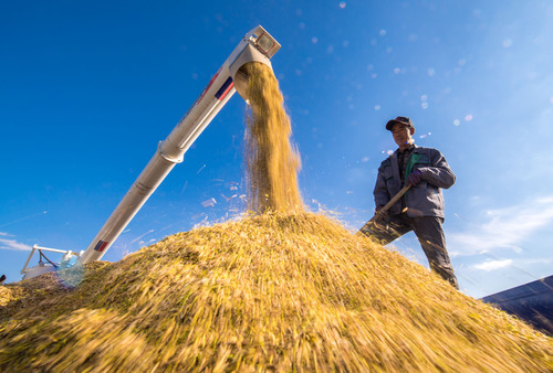 在吉林省吉林市一拉溪鎮(zhèn),農(nóng)民在運(yùn)糧車上整理收割機(jī)收獲的水稻(2018年9月17日攝)。新華社記者 許暢 攝
