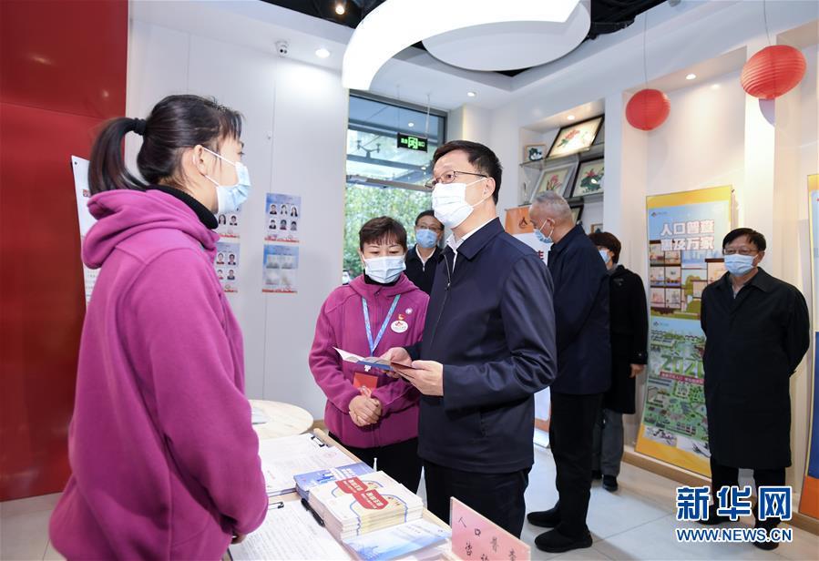 11月3日,中共中央政治局常委、國務(wù)院副總理、國務(wù)院第七次全國人口普查領(lǐng)導(dǎo)小組組長韓正在北京調(diào)研人口普查登記工作。這是韓正在西城區(qū)金融街街道豐融園社區(qū)居委會調(diào)研。 新華社記者 張領(lǐng) 攝
