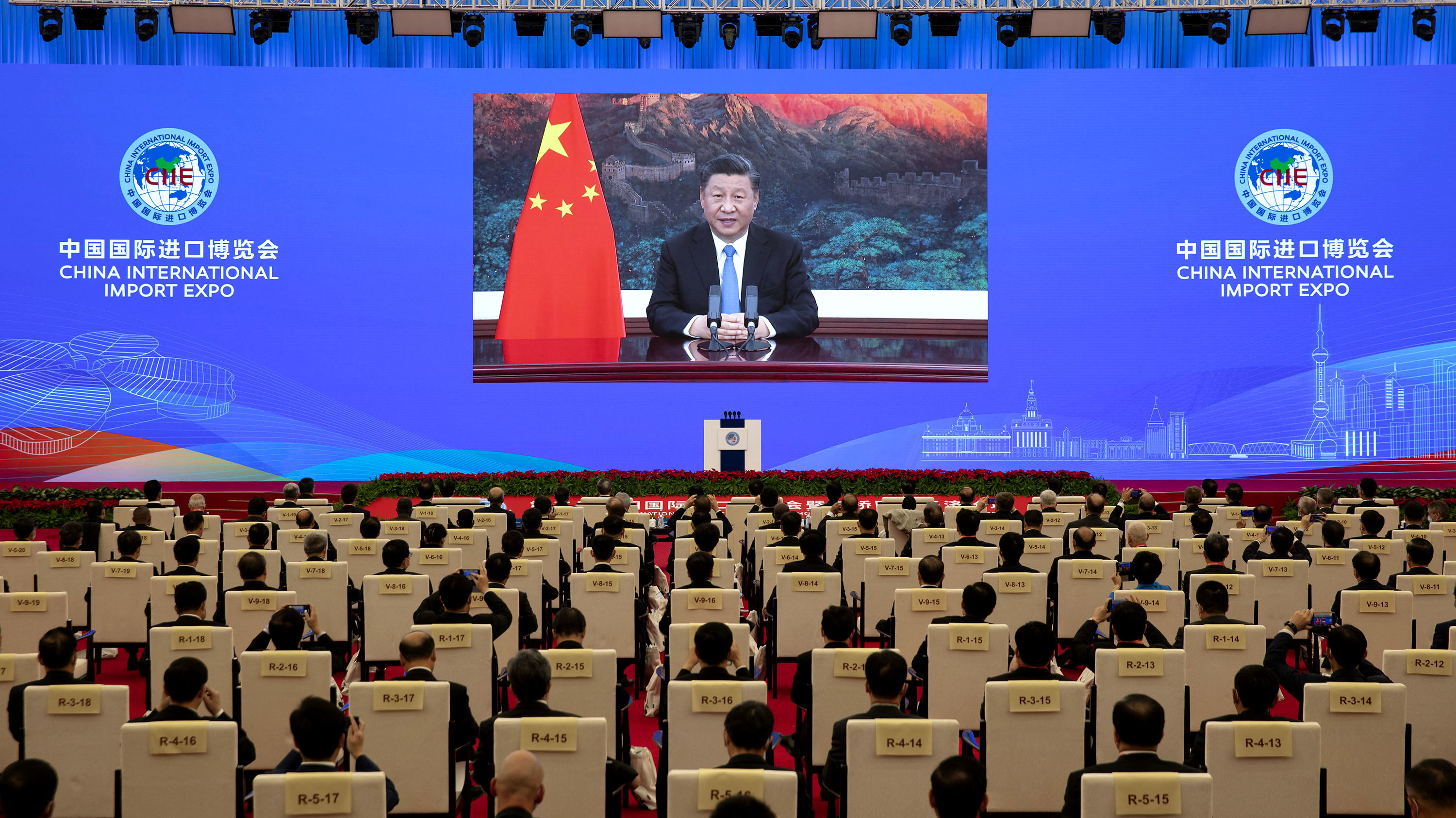 11月4日晚,習(xí)近平在第三屆中國國際進口博覽會開幕式上以視頻方式發(fā)表主旨演講。新華社記者 黃敬文 攝