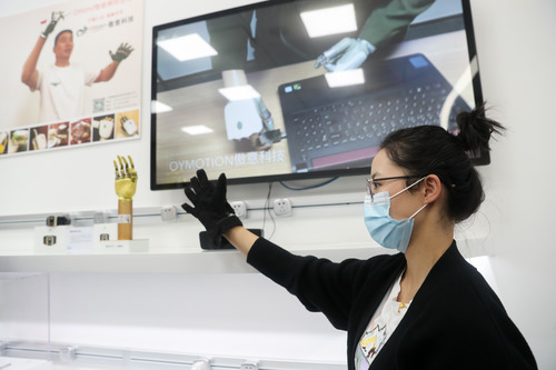 在上海張江人工智能島內,工作人員在展示“智能神經仿生手”(11月3日攝)。新華社記者 丁汀 攝