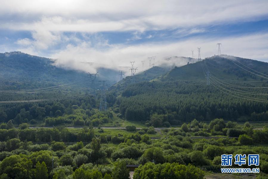 內(nèi)蒙古阿爾山市五岔溝鎮(zhèn)大山深處,輸電塔高聳山間(7月4日攝)?!⌒氯A社發(fā)(畢力格 攝)