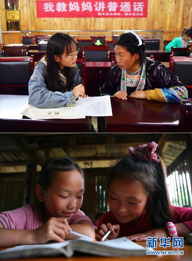 這是一張拼版照片,上圖為:2020年4月1日,在烏英苗寨“雙語雙向”培訓(xùn)班課堂上,大一學(xué)生潘木枝(左)在教媽媽講普通話(新華社記者黃孝邦攝);下圖為:2010年5月27日,在烏英教學(xué)點,二年級學(xué)生潘木枝(左)在課堂上學(xué)習(xí)(龍濤攝)。新華社發(fā)