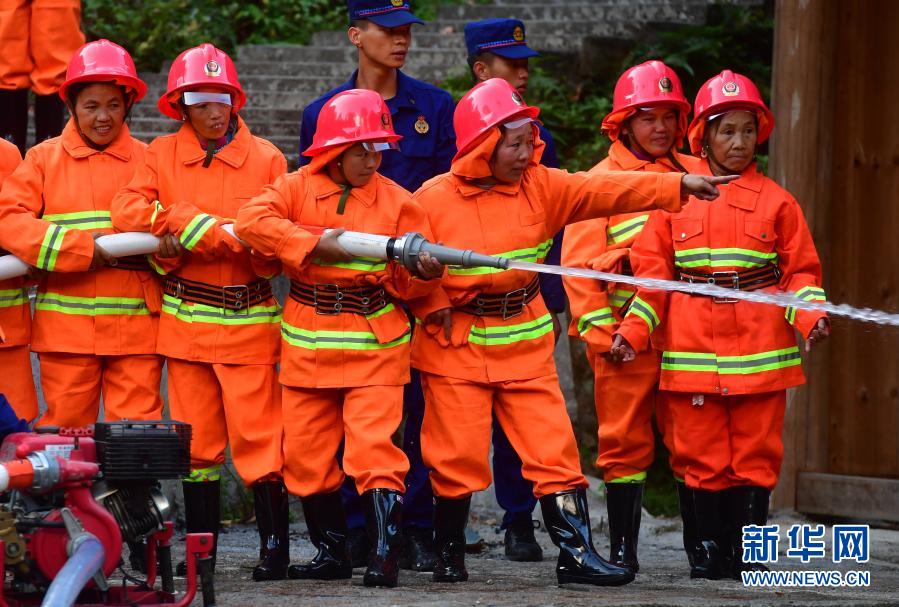 烏英苗寨女子志愿消防隊隊員梁足英(右三)和隊友們在融水縣消防救援大隊消防隊員的指導(dǎo)下進行消防演練(11月19日攝)。新華社記者 黃孝邦 攝