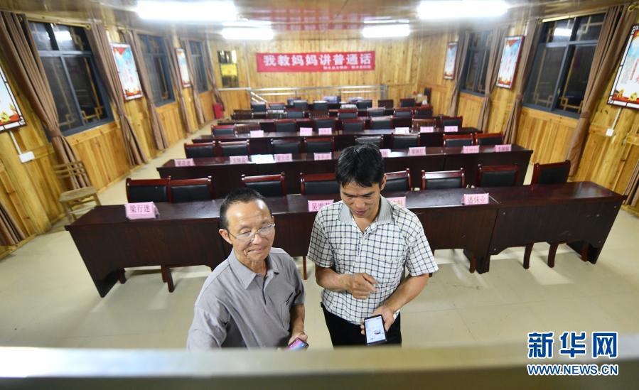 在烏英苗寨,黨鳩村村委會副主任梁秀平(右)在研究“雙語雙向”培訓(xùn)班的課堂內(nèi)容(6月18日攝)。新華社記者 黃孝邦 攝
