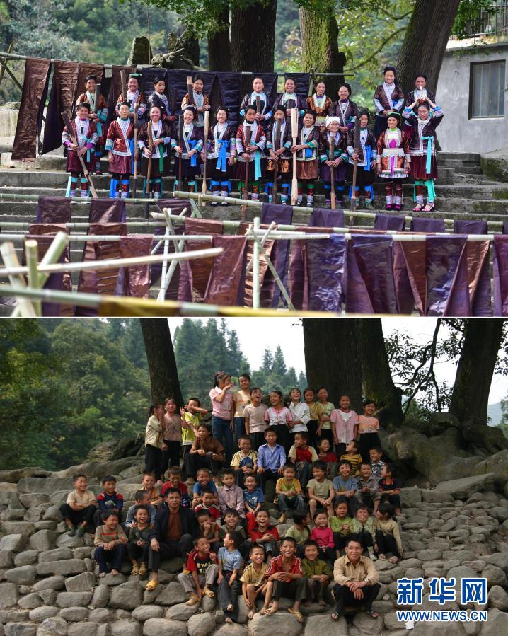 這是一張拼版照片,上圖為:2020年10月25日,烏英苗寨“雙語雙向”培訓(xùn)班的同學(xué)們在古樹下合影(新華社記者黃孝邦攝);下圖為:2006年9月19日,烏英苗寨教學(xué)點的師生們在古樹下合影(龍濤攝)。新華社發(fā)