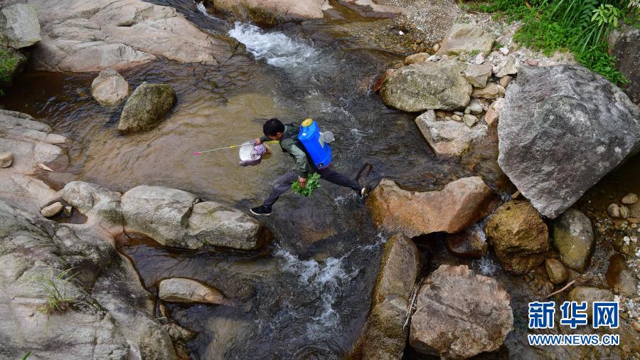 烏英苗寨水果種植專業(yè)合作社負(fù)責(zé)人梁秀前過河去除草(2019年7月25日攝)。新華社記者 黃孝邦 攝
