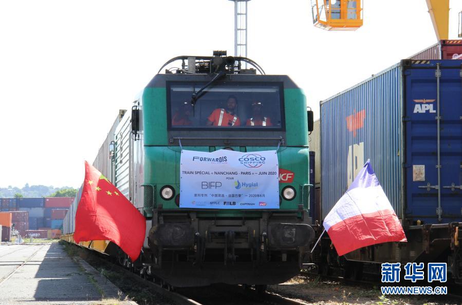 6月23日,滿載防疫物資的中歐班列抵達(dá)法國巴黎東南郊的瓦朗通,此次班列是中法首趟抗疫物資專列。新華社記者 徐永春 攝
