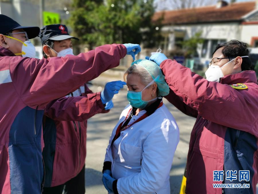 4月4日,中國赴塞爾維亞抗疫醫(yī)療專家組在貝爾格萊德的基層發(fā)熱門診走訪時(shí),幫助塞爾維亞醫(yī)生特里富諾維奇(中)佩戴高標(biāo)準(zhǔn)的防護(hù)口罩。新華社發(fā)