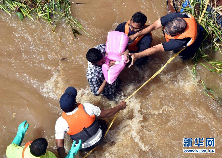10月18日,救援人員從印度海得拉巴一處被洪水圍困的房屋中救出一名嬰兒。新華社發(fā)