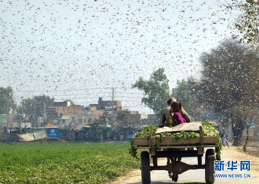 2月15日,在巴基斯坦東部旁遮普省的奧卡拉地區(qū),漫天的蝗蟲肆虐(手機(jī)照片)。新華社發(fā)