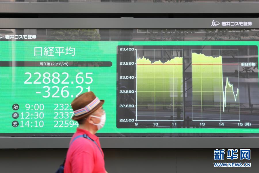 8月28日,日本東京街頭的一處電子股指顯示屏顯示,下午14時(shí)左右,受時(shí)任日本首相安倍晉三或因健康原因辭職影響,股市指數(shù)急速下跌。新華社記者 杜瀟逸 攝