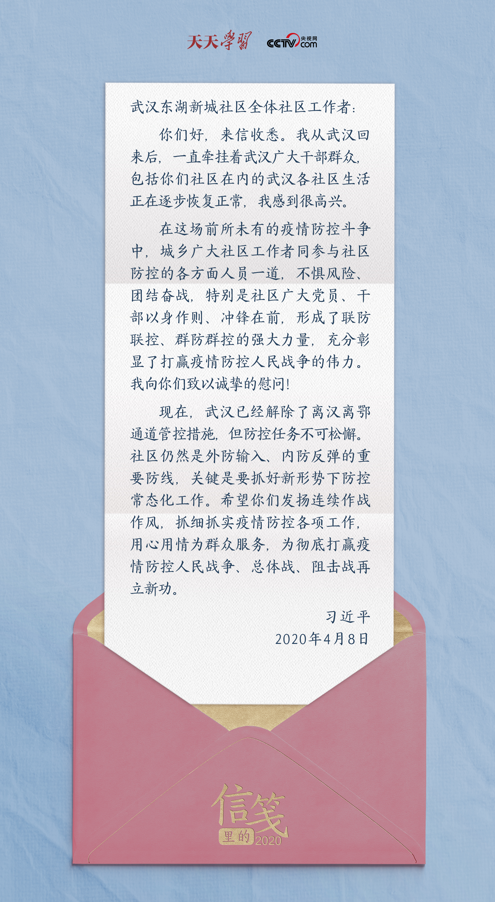 4月8日,武漢解封。在給武漢東湖新城社區(qū)全體社區(qū)工作者的回信中,總書記再次肯定城鄉(xiāng)廣大社區(qū)工作者在疫情防控斗爭(zhēng)中發(fā)揮的重要作用,并鼓勵(lì)他們“抓細(xì)抓實(shí)疫情防控各項(xiàng)工作,用心用情為群眾服務(wù)”,再立新功。