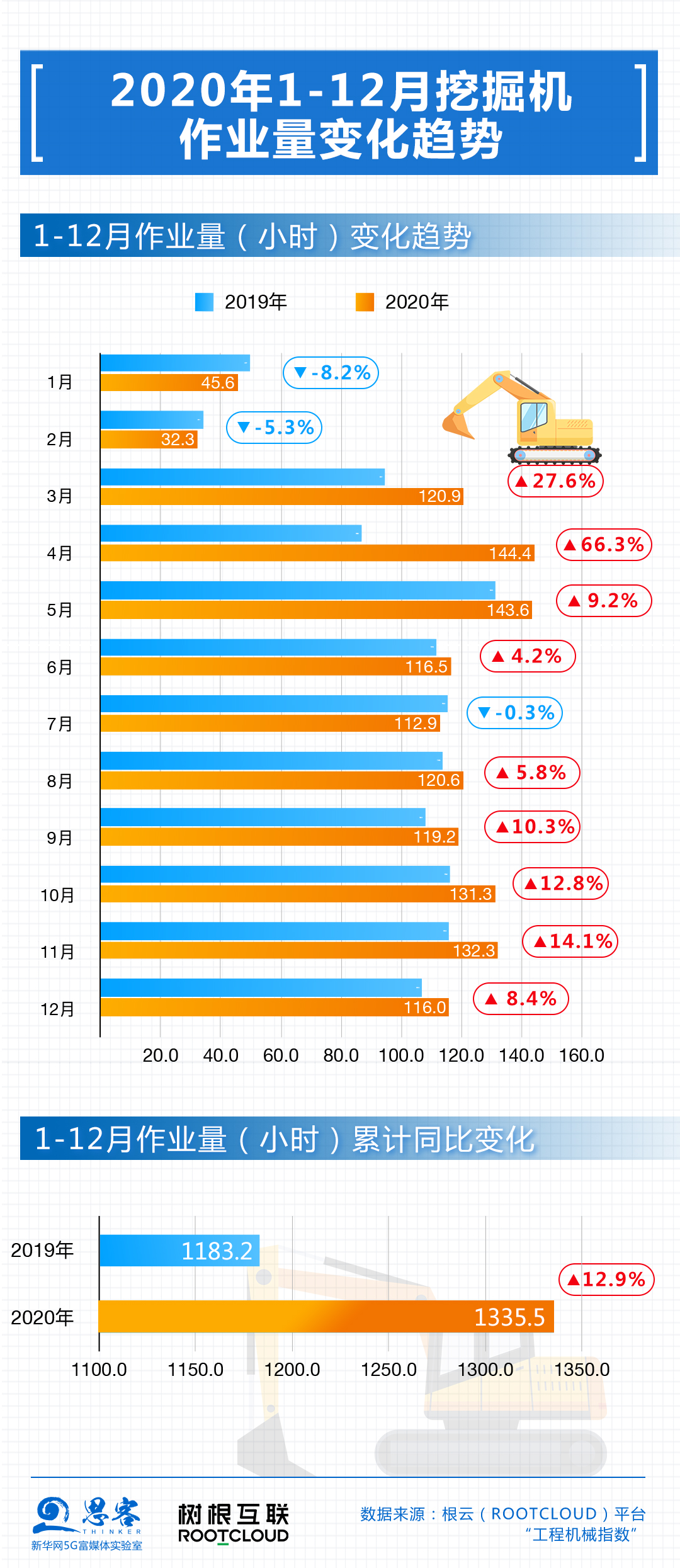 從三一重工孵化的工業(yè)互聯(lián)網(wǎng)平臺——樹根平臺的“工程機械指數(shù)”實時數(shù)據(jù)看,2020年全年挖掘機累計工作時間超越去年同期,同比上漲12.9%。與此同時,四季度數(shù)據(jù)尤其令人欣喜,10月、11月、12月三個月份從銷量到工作時間,均保持較為高速和平穩(wěn)的增長。樹根互聯(lián)聯(lián)合創(chuàng)始人、CEO賀東東說,“挖掘機指數(shù)”不僅反映經(jīng)濟活力,還清晰展現(xiàn)中國基建的火熱圖景。
