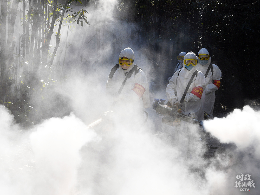 △2020年2月,安徽亳州市,環(huán)衛(wèi)黨員突擊隊(duì)隊(duì)員對(duì)社區(qū)進(jìn)行防疫消殺。