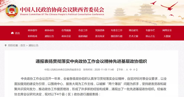 中央政協(xié)工作會議召開一年多來,陜西全省各級政協(xié)組織認真貫徹落實會議精神,堅持建言資政和凝聚共識雙向發(fā)力,推動政協(xié)工作提質(zhì)增效,形成了許多新的經(jīng)驗和成果,涌現(xiàn)出了一批先進基層政協(xié)組織。2020年11月2日,省政協(xié)十二屆四十七次主席會議決定通報表揚貫徹落實中央政協(xié)工作會議精神先進基層政協(xié)組織,金臺區(qū)政協(xié)、富平縣政協(xié)、富縣政協(xié)和柞水縣政協(xié)4家縣(區(qū))政協(xié)組織榜上有名。