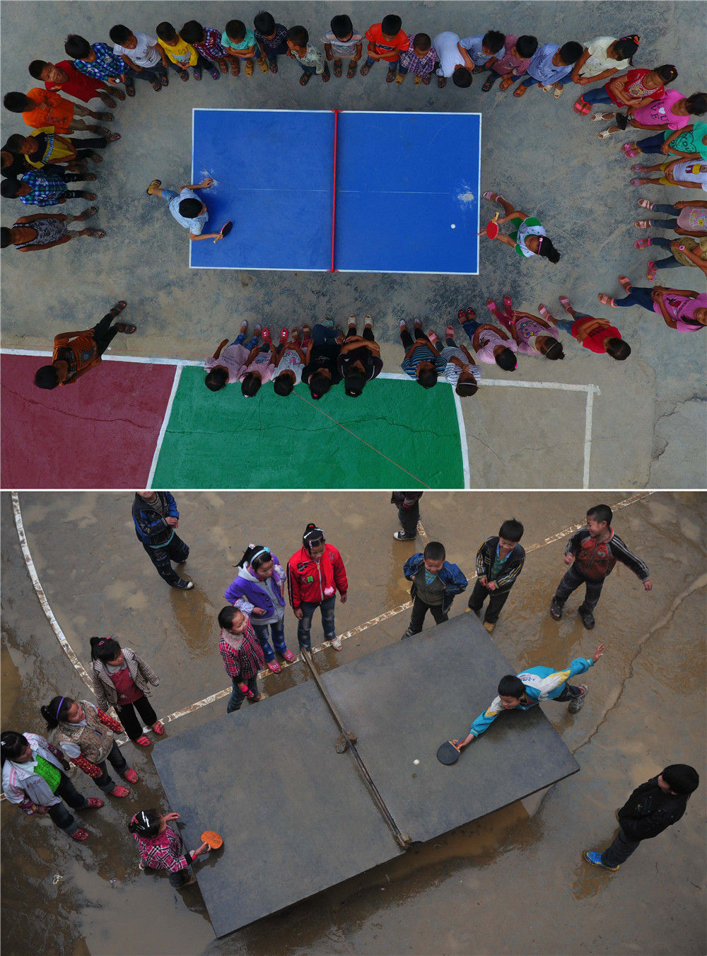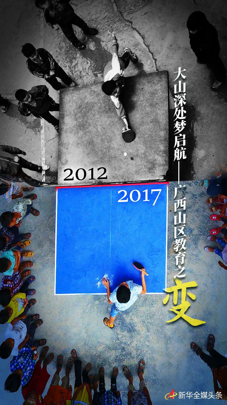 拼版照片:上圖為在廣西大化瑤族自治縣板升鄉(xiāng)弄勇小學(xué),孩子們?cè)诖蚱古仪颍?017年9月4日攝,無(wú)人機(jī)照片);下圖為在弄勇小學(xué),孩子們?cè)诖蚱古仪颍?012年12月26日攝)。新華社記者 黃孝邦 攝