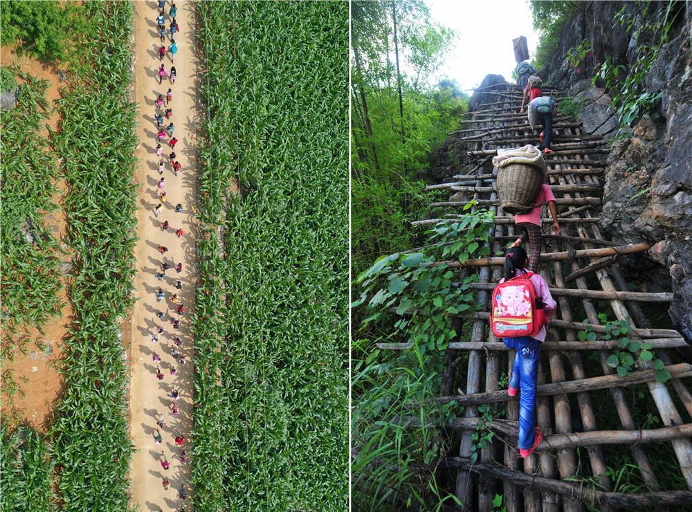拼版照片:左圖為在廣西大化瑤族自治縣板升鄉(xiāng)弄勇村,孩子們走在放學(xué)路上(2019年5月10日攝,無(wú)人機(jī)照片);右圖為在弄勇村弄頂屯,孩子們扛著生活用具,爬懸梯回家(2012年7月4日攝)。目前,弄勇村所有的屯都已告別沒有公路的歷史。新華社記者 黃孝邦 攝