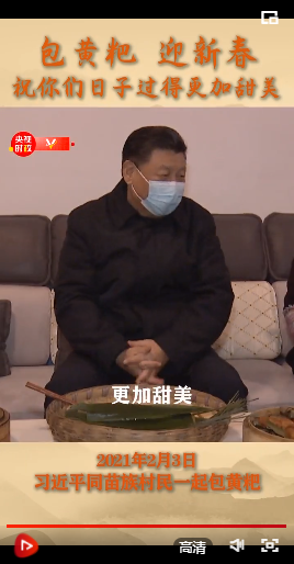 在苗族村民趙玉學(xué)家,習(xí)近平同一家人圍坐客廳,邊聊家常邊制作當(dāng)?shù)貍鹘y(tǒng)節(jié)日食品黃粑??倳浻H手用粽葉裹著糯米、黃豆面包好一個(gè)黃粑,微笑著說(shuō):“我包過(guò)大粽子,這么小的沒(méi)有。很好很好,(祝你們今后的)日子過(guò)得更加幸福、更加甜美!”
