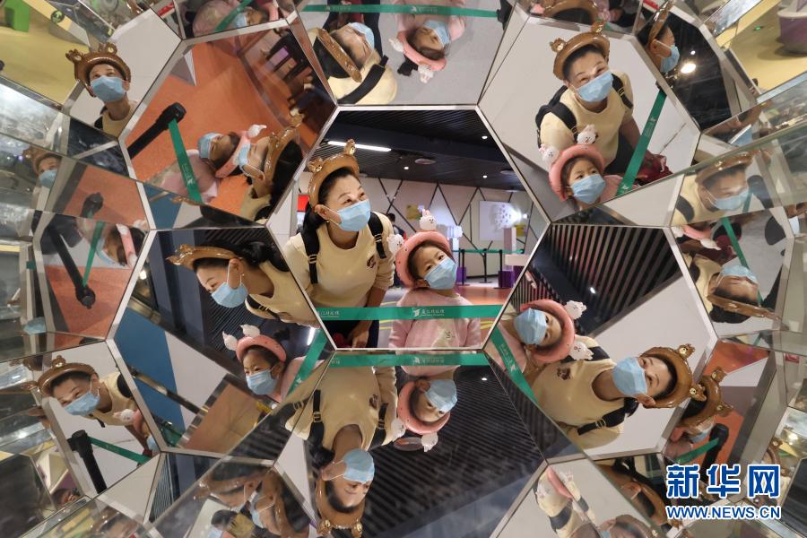 2月16日,小朋友和家長(zhǎng)在廈門科技館體驗(yàn)鈍角六面體鏡。新華社發(fā)(曾德猛 攝)