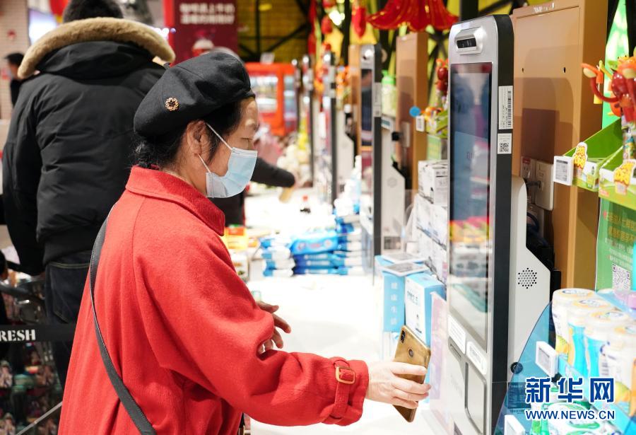 2月15日,在北京市海淀區(qū)的七鮮超市北京華宇店,顧客通過(guò)自助收銀機(jī)結(jié)帳。新華社記者 任超 攝