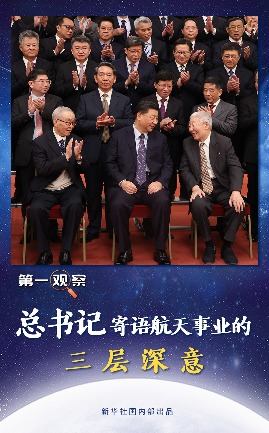 在與嫦娥五號任務參研參試人員代表合影時,習近平總書記身邊就座的,是兩位特殊的“90后”和“80后”:已經(jīng)90多歲高齡的探月工程首任總設計師孫家棟院士和年逾八旬的探月工程首任總指揮欒恩杰院士。合影前后,總書記同他們親切交流。