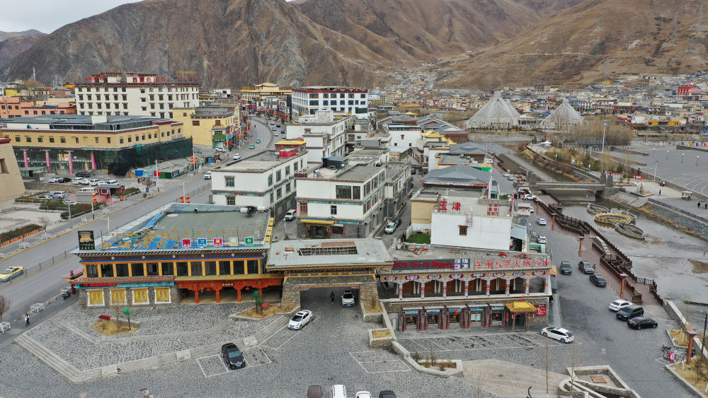 ↑ 圖為2021年3月10日拍攝的玉樹市一處商業(yè)區(qū)(地震前為結古寺賓館)。