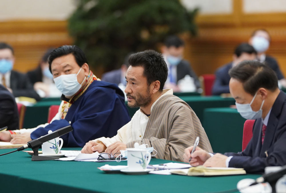 ↑ 3月7日,在參加十三屆全國人大四次會議青海代表團審議時,扎西多杰就玉樹災后重建新變化發(fā)言。新華社記者李學仁攝