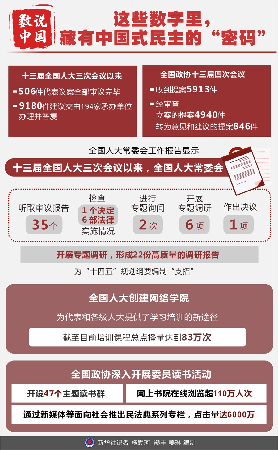 數(shù)字,蘊(yùn)藏中國(guó)式民主的“密碼”。透過全國(guó)人大常委會(huì)工作報(bào)告、全國(guó)政協(xié)常委會(huì)工作報(bào)告和提案工作情況報(bào)告,讓我們從幾組關(guān)鍵數(shù)據(jù)進(jìn)行“解碼”。