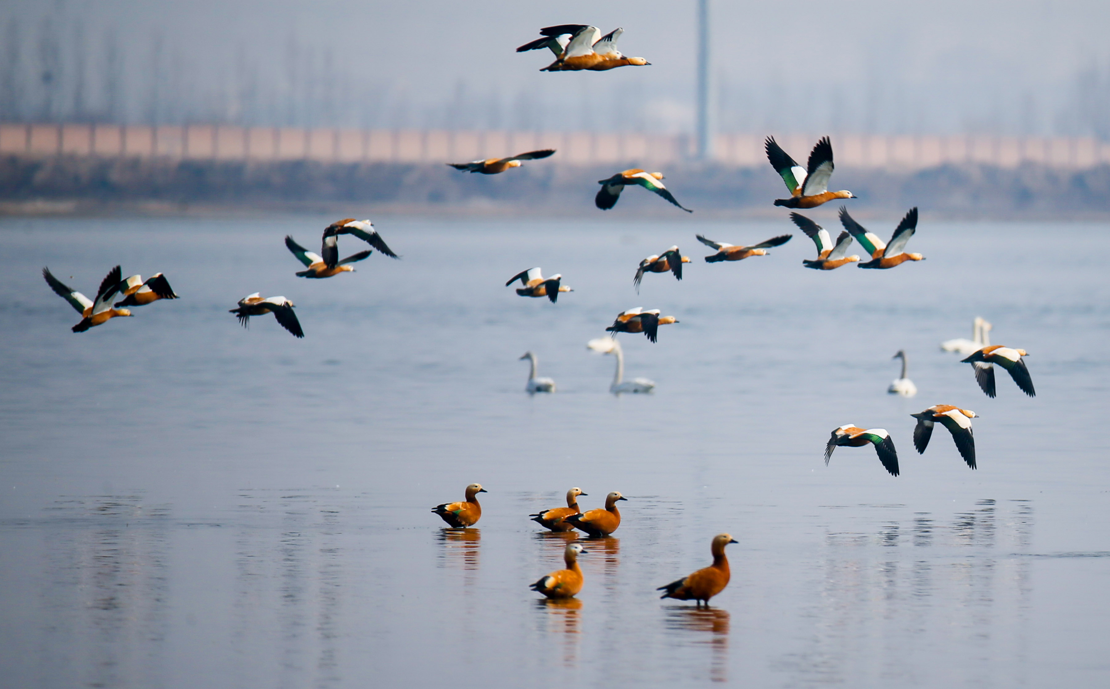 △2021年3月9日,內(nèi)蒙古呼和浩特市土默特左旗的海流水庫,成群的候鳥在水面上嬉戲。