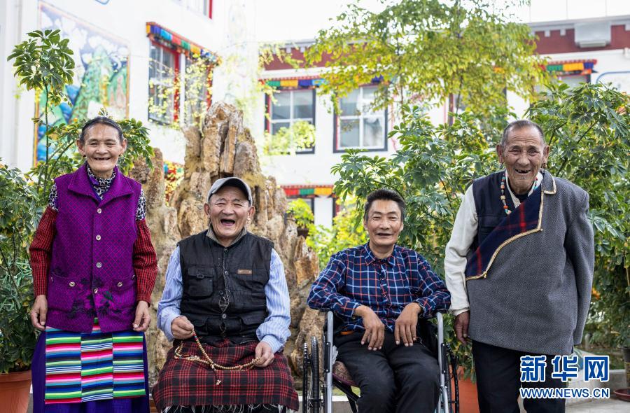 80歲的次旦(右一)在集中供養(yǎng)服務中心跟朋友們合影(3月19日攝)。