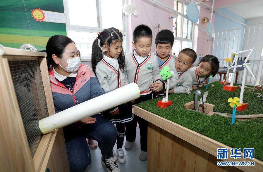 3月22日,在河北省石家莊市橋西區(qū)瑞特幼兒園,老師通過“風(fēng)的超能力”科普實(shí)驗(yàn),讓孩子們感受風(fēng)能的作用。新華社發(fā)(梁子棟 攝)