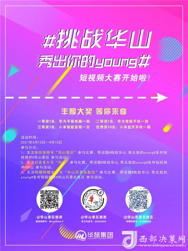 朝氣蓬勃的青年學生擁有敏銳的感受力和發(fā)現(xiàn)美的能力。為了進一步挖掘華山獨特自然風光及厚重的文化內(nèi)涵,激發(fā)大學生群體的創(chuàng)作才能,華旅集團營銷中心特向大學生推出“挑戰(zhàn)華山 秀出你的young”短視頻大賽,在比賽之余,可圍繞華山自然風光、人文歷史、傳說典故、道教文化等進行創(chuàng)作,以年輕人的視角展示華山獨特之美,活動自4月10日起,在微信視頻號(華山景區(qū))、抖音APP(華山)、嗶哩嗶哩(華山風景名勝區(qū))等平臺正式啟動。