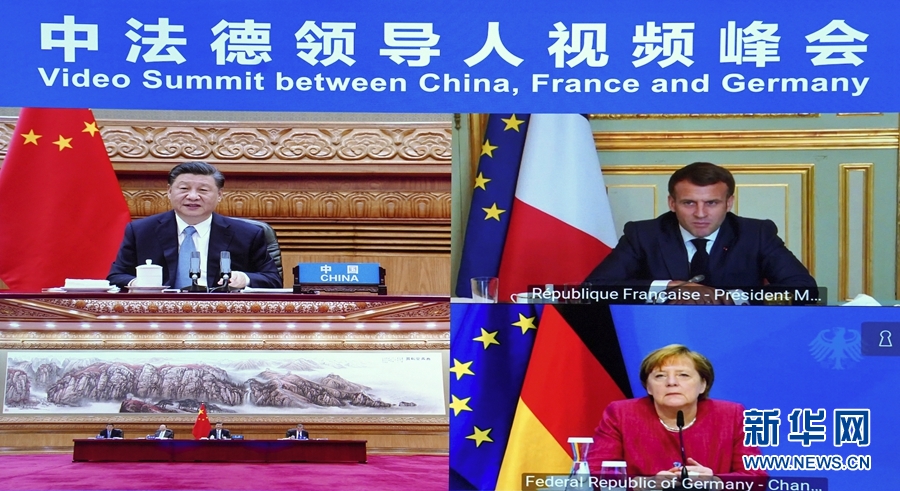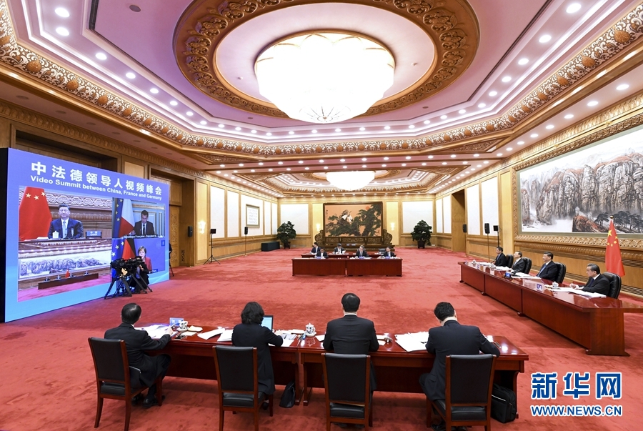4月16日下午,國家主席習近平在北京同法國總統(tǒng)馬克龍、德國總理默克爾舉行中法德領導人視頻峰會。新華社記者 李學仁 攝