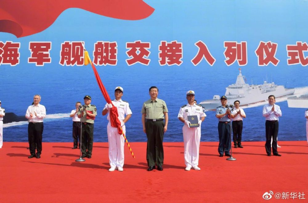 下午3時30分許,交接入列儀式開始,全場高唱中華人民共和國國歌,五星紅旗冉冉升起。儀仗禮兵護衛(wèi)著八一軍旗、命名證書,正步行進到主席臺前。習近平將八一軍旗、命名證書分別授予長征18號艇艇長、政治委員,大連艦艦長、政治委員,海南艦艦長、政治委員。三型艦艇的艦艇長、政治委員向習近平敬禮,從習近平手中接過八一軍旗、命名證書。習近平同他們合影留念。