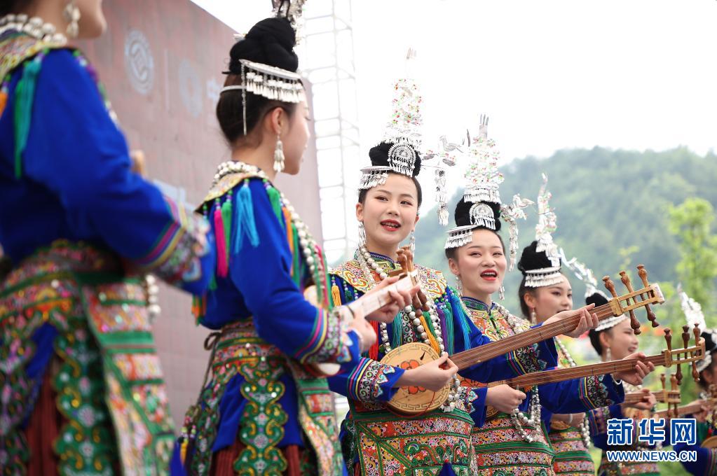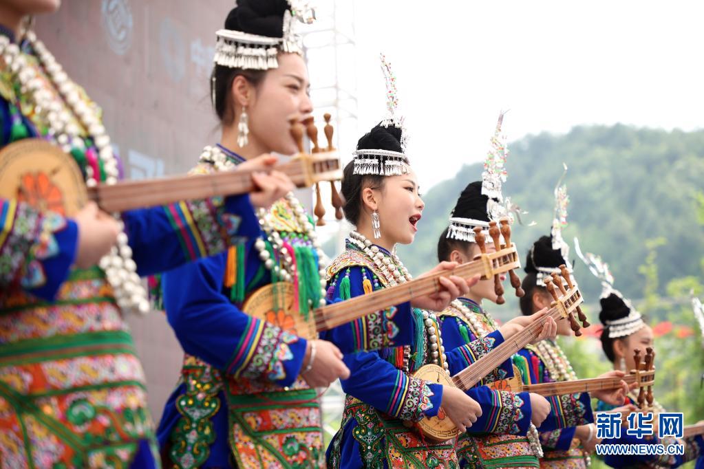 5月16日,演員在丹寨縣萬達(dá)小鎮(zhèn)非遺歌舞展演活動(dòng)上表演侗族琵琶歌。