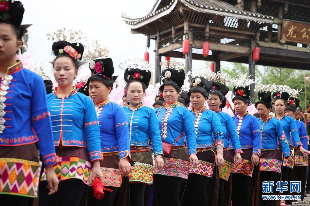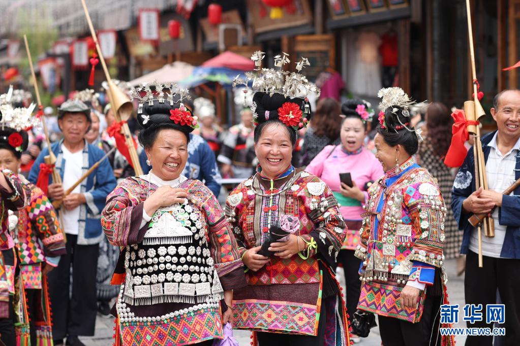 當(dāng)日,貴州省黔東南苗族侗族自治州丹寨縣萬達(dá)小鎮(zhèn)在“第二屆中國丹寨非遺周”中舉辦苗族盛裝巡游、非遺歌舞展演活動(dòng)。