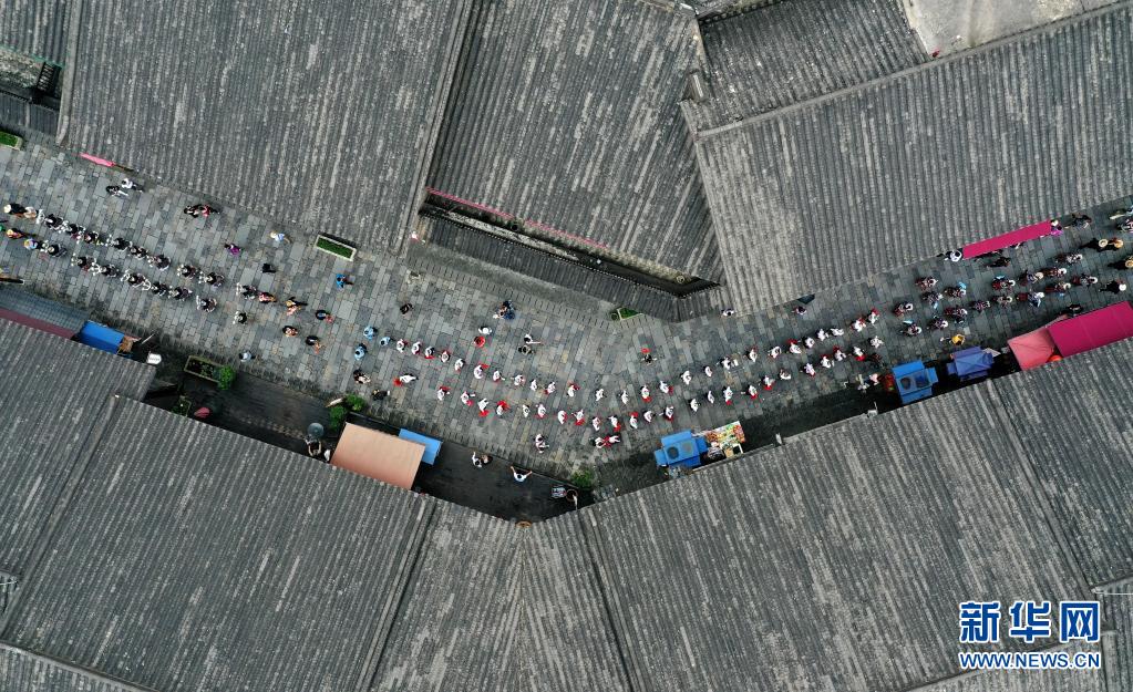 5月16日,身著盛裝的苗族群眾在丹寨萬達(dá)小鎮(zhèn)參加服飾展示活動(dòng)(無人機(jī)照片)。