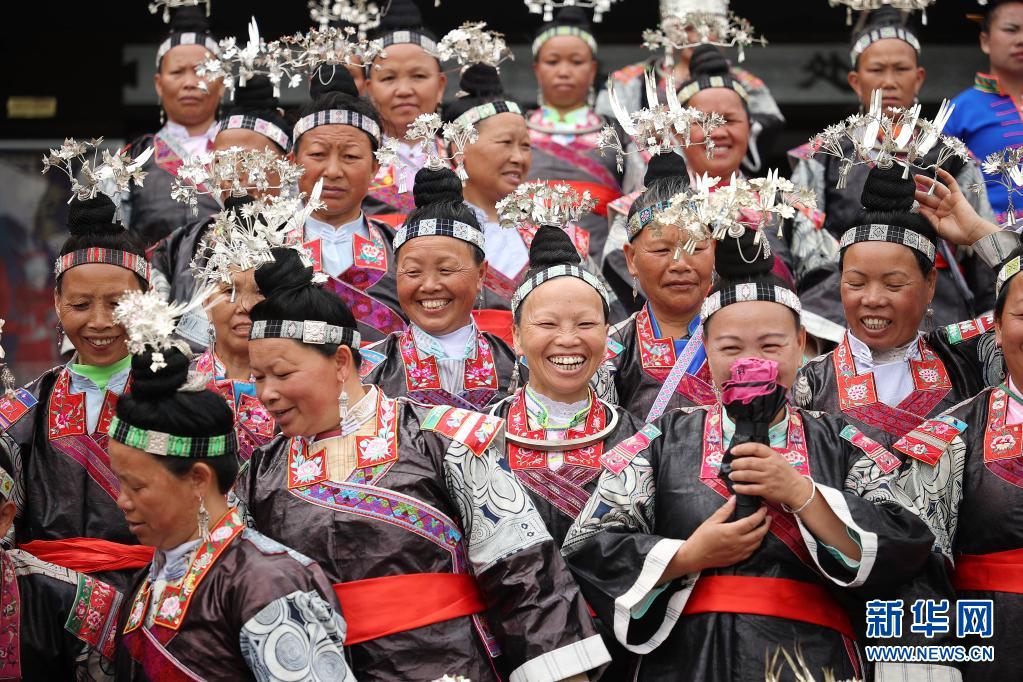 5月16日,身著盛裝的苗族群眾在丹寨萬達(dá)小鎮(zhèn)參加服飾展示活動(dòng)。