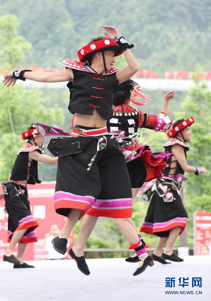 5月16日,演員在丹寨縣萬達(dá)小鎮(zhèn)非遺歌舞展演活動(dòng)上表演苗族踩鼓舞。