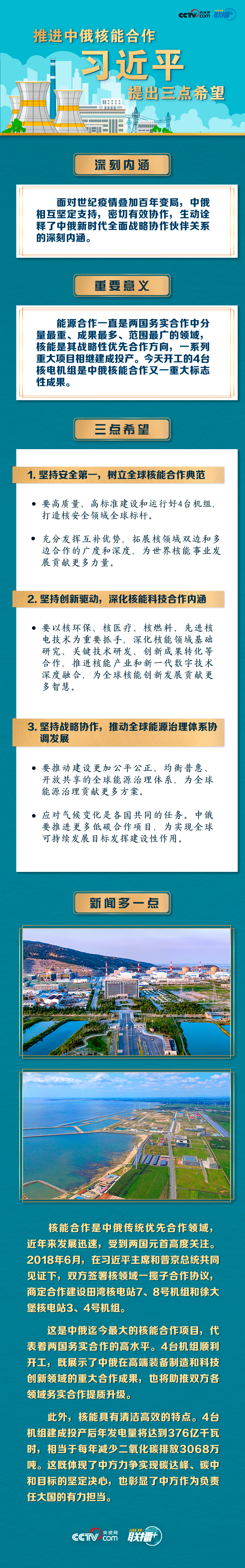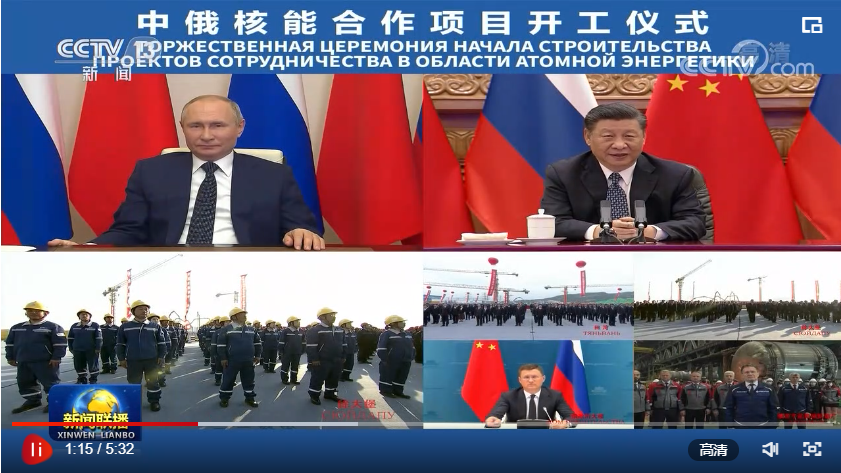 聯(lián)播+“今年是《中俄睦鄰友好合作條約》簽署20周年。我同普京總統(tǒng)商定,將在更高水平、更廣領域、更深層次推進雙邊關系向前發(fā)展。”5月19日,習近平主席在北京通過視頻連線,同俄羅斯總統(tǒng)普京共同見證兩國核能合作項目——田灣核電站和徐大堡核電站開工儀式。