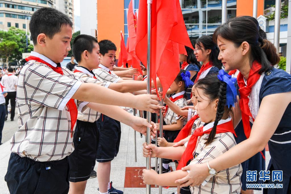 當(dāng)日,廣西南寧市濱湖路小學(xué)舉行“紅領(lǐng)巾心向黨 爭(zhēng)做新時(shí)代好隊(duì)員”為主題的少先隊(duì)員入隊(duì)儀式,一年級(jí)學(xué)生在“六一”前戴上紅領(lǐng)巾,光榮加入中國(guó)少年先鋒隊(duì)?!?/p>