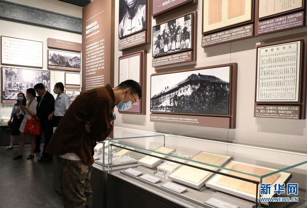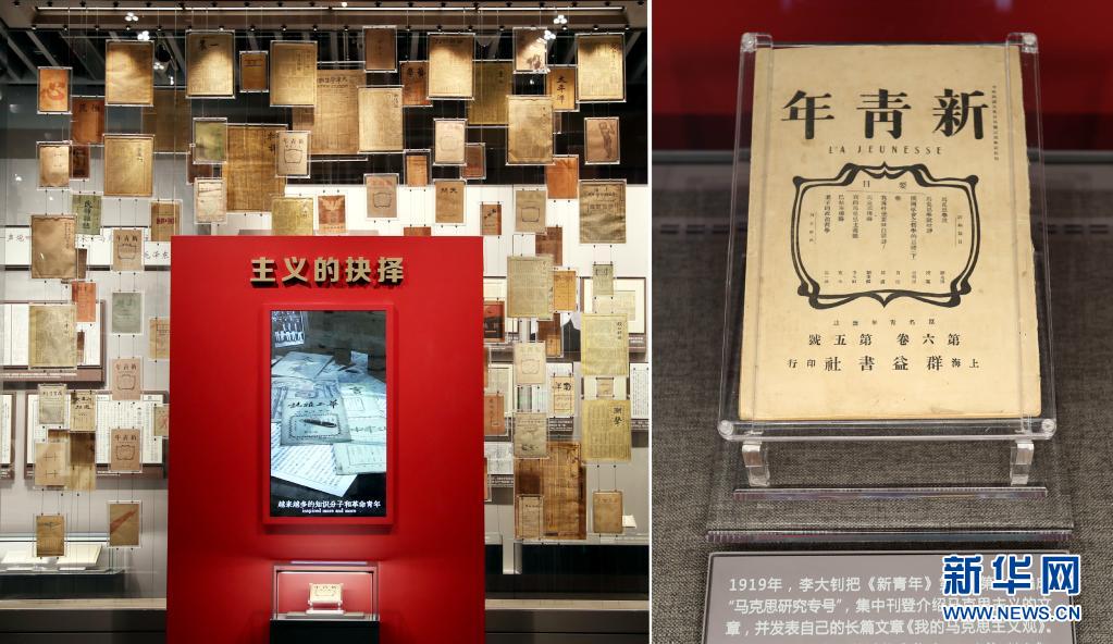 大型立體式視覺置景名為“主義的抉擇”,100件五四運動前后傳播馬克思主義、社會主義的報紙雜志,錯落陳列在玻璃墻上。其中,《新青年》第6卷第5號“馬克思研究專號”在前端“高光”展示,這期“專號”標志著馬克思主義在中國的傳播進入了較為系統(tǒng)的階段(6月1日攝)。新華社記者 劉穎 攝